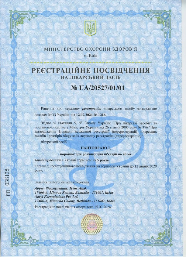 Дози до 240 мг при внутрішньовенному введенні протягом 2 хвилин добре переносилися. Лікування. Оскільки пантопразол екстенсивно зв’язується з білками, він не належить до лікарських засобів, що легко виводяться за допомогою діалізу. У разі передозування з появою клінічних ознак інтоксикації застосовують симптоматичну та підтримувальну терапію. Рекомендацій щодо специфічної терапії немає.